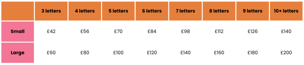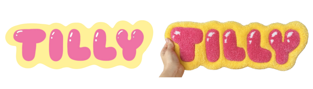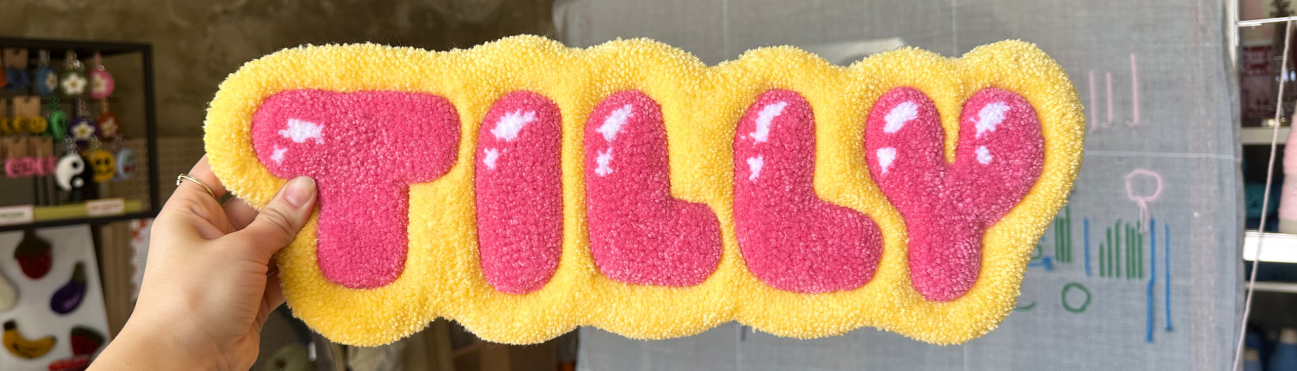 Custom tufted names and words available in a range of fonts, sizes, and colours.